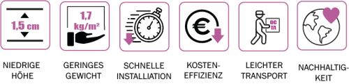 - Niedrige Aufbauhöhe* von 15mm ermöglicht rasches Aufheizen der Räume.